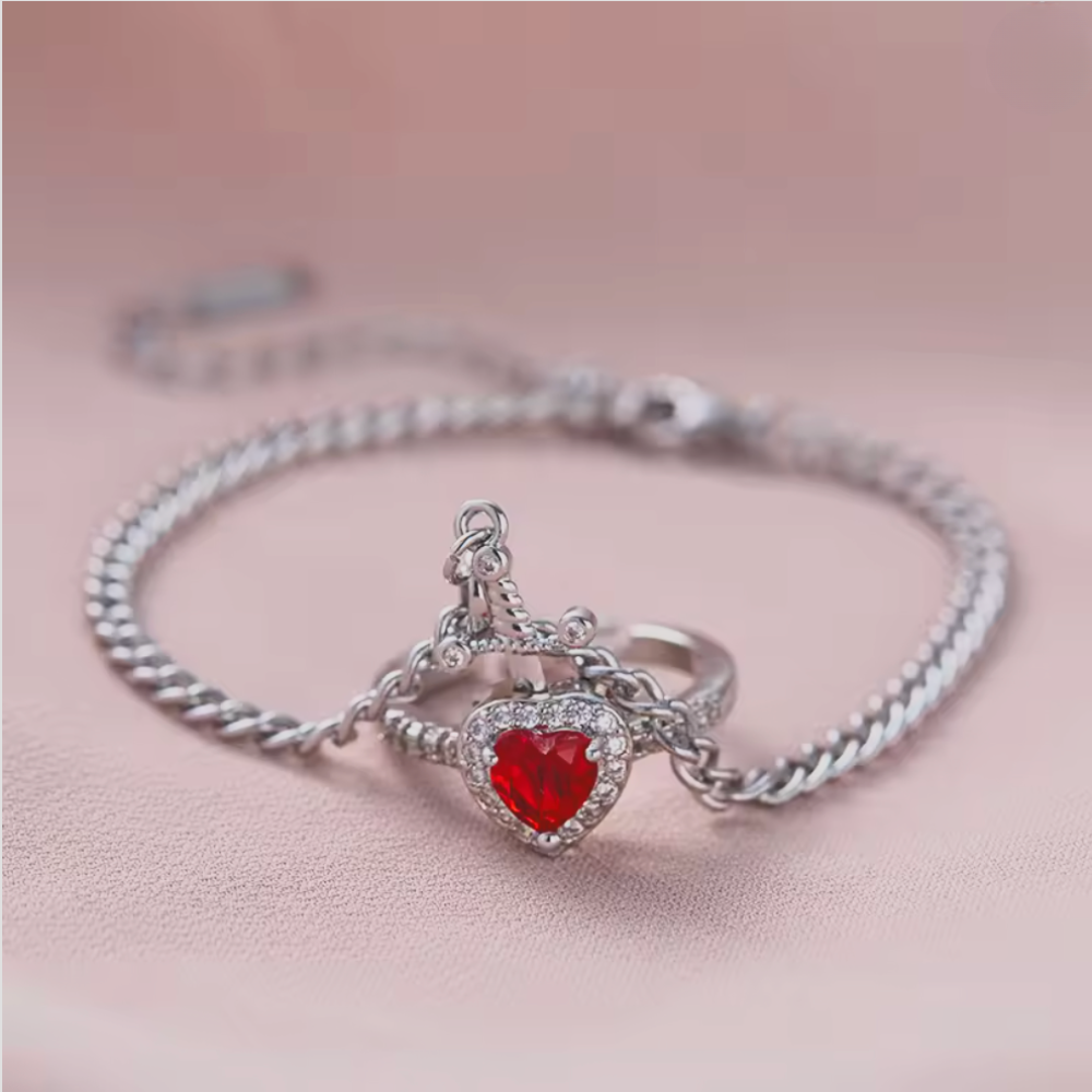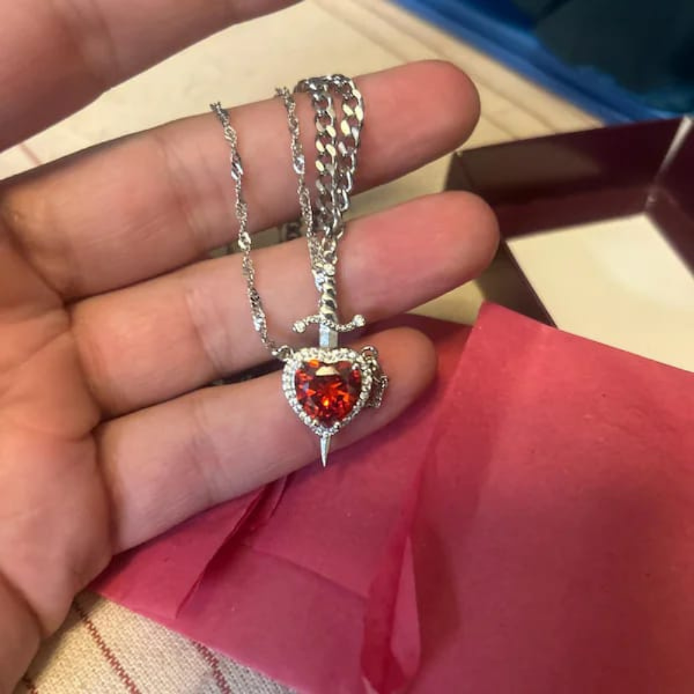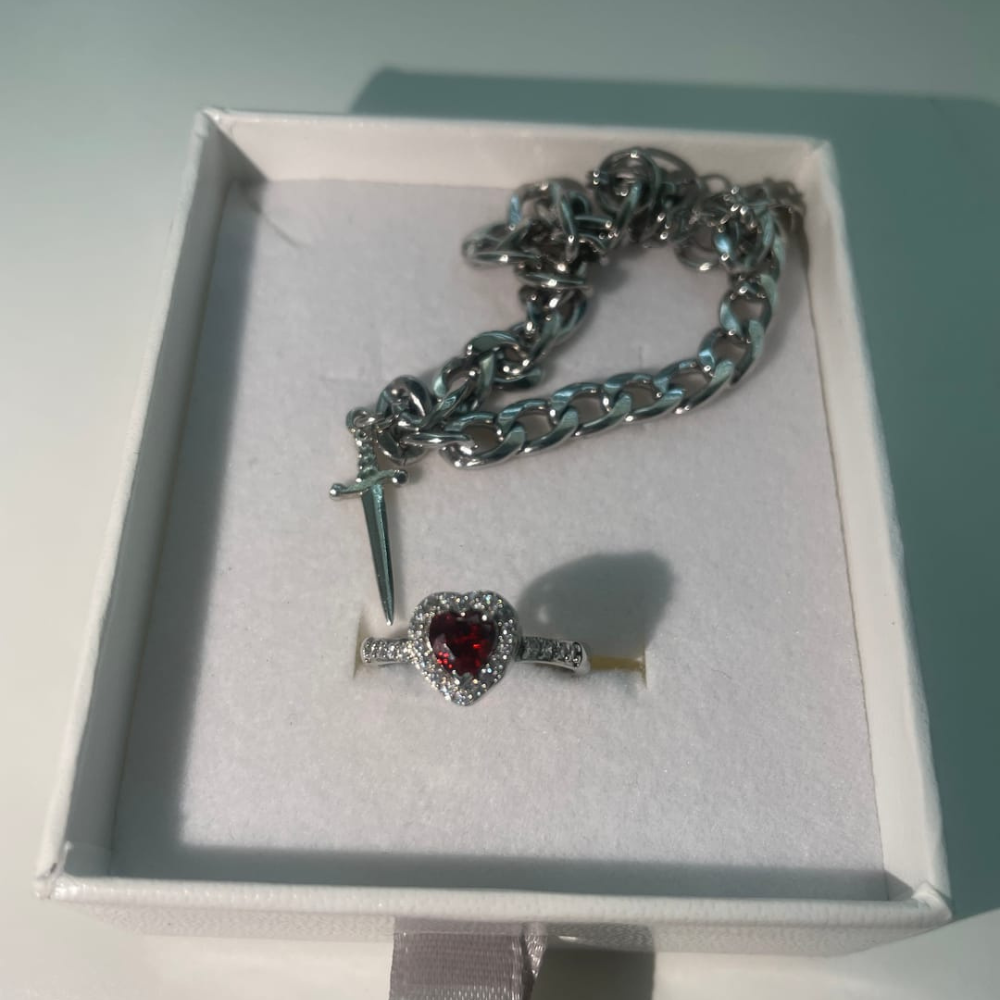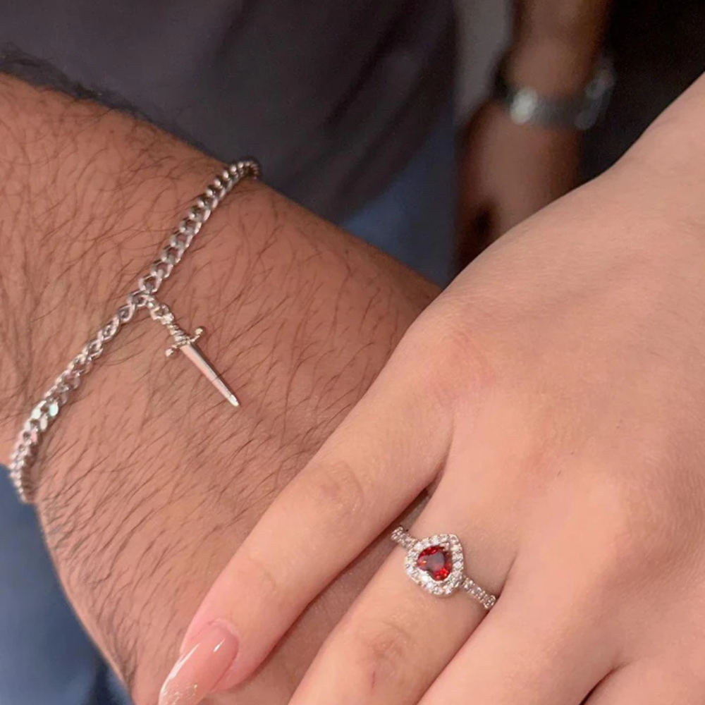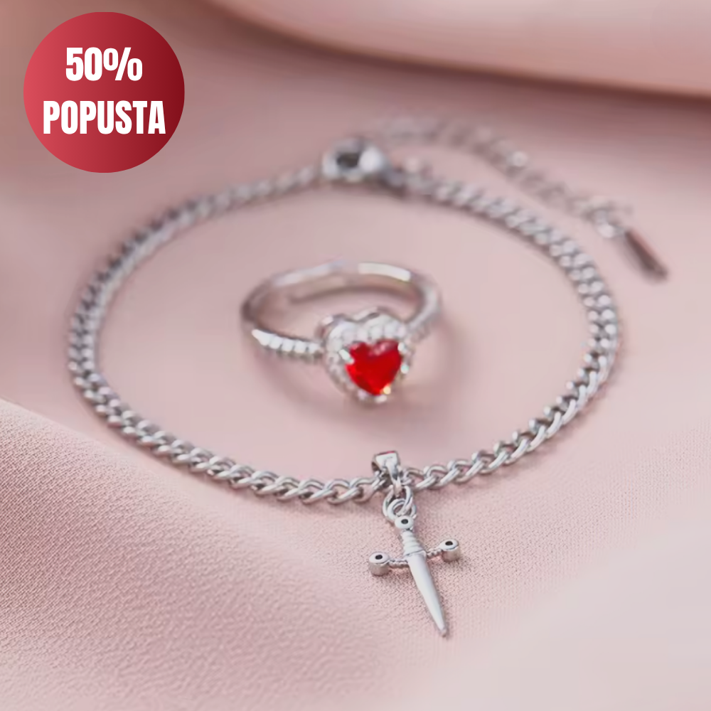 Ova narukvica nosi više od stila — ona je poruka. Mač kao privjezak ne simbolizuje borbu, već odanost, zaštitu i spremnost da čuvaš ono što voliš. U kombinaciji sa prstenom sa crvenim srcem, ovaj set postaje pravi mali savjez između dvoje.