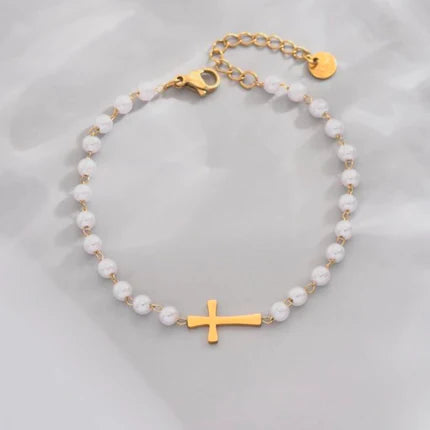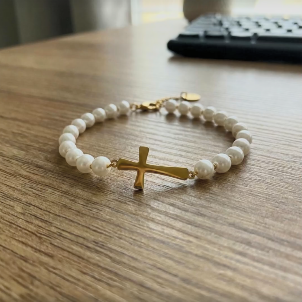 Na dodir mekani biseri i lagana forma narukvice stvaraju osjećaj topline i bliskosti. Njena suptilnost ne vapi za pažnjom, već je osvoji lako – pogledom, gestom, svjetlom koje se prelama na zlatnom krstu. To je nakit koji ne pokušava da impresionira, već da ostane kao simbol nečeg ličnog, tihog i trajnog.